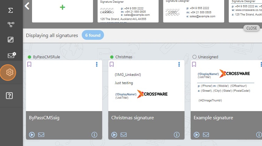 1. Navigate to https://portal.crossware365.com/cms/designer/signatures > Select the Settings icon